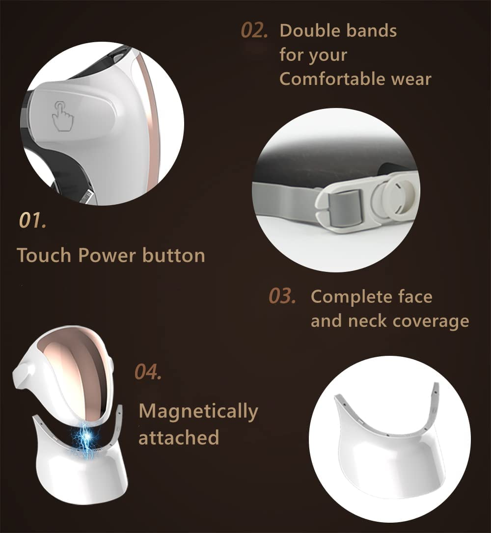 PATENTED DESIGN WITH FULL FACE AND NECK COVERAGE The Neck Cover is a patented design that uses magnets to secure to the face mask. You can line up or take off neck mask any time-use the face mask alone or use face+neck at the same time! Simply press the touch pad on the upper right side of the mask to power on and off.